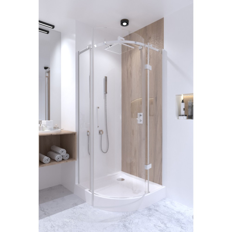 Душевая кабина Qtap Virgo CRM1099AC8 Clear - это современное безрамное ограждение в форме четверти круга, предназначенное для установки как на поддон, так и непосредственно на пол. Модель выделяется использованием толстого безопасного стекла и минималистичным дизайном с хромированным профилем.