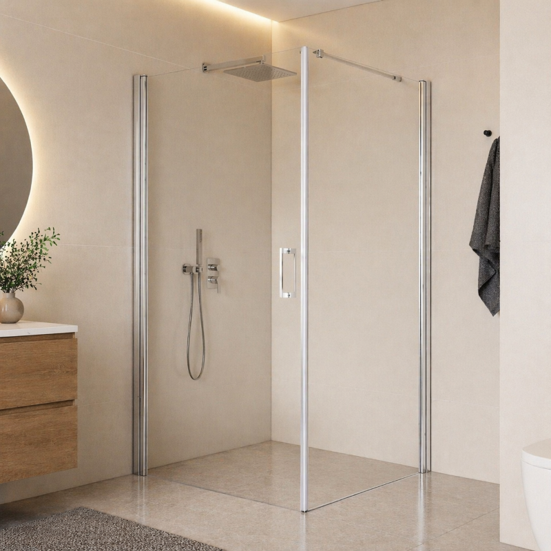 Комплектация - душевые стекла, комплект креплений, петли, ручка