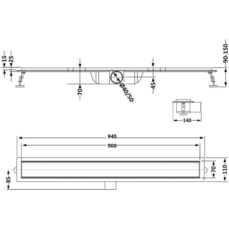 Данная модель выполнена с горизонтальным выпускным отверстием диаметром 40 мм и декоративной решеткой, которая изготовлена из нержавеющей стали и при необходимости преобразуется в лоток под укладку керамической плитки.