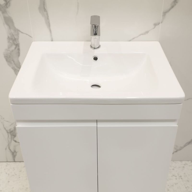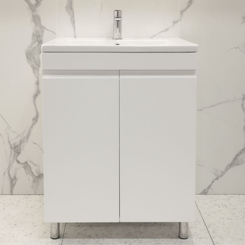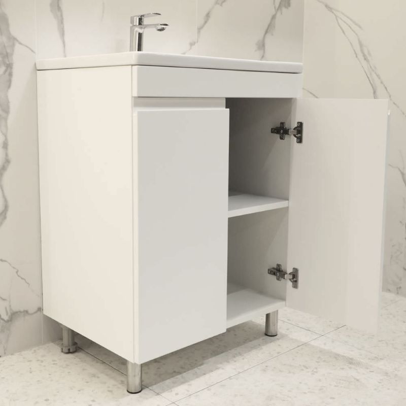 Напольная тумба под умывальник Argo 60 оснащена двумя распашными дверьми. Корпус выполнен из ДСП в белом цвете, имеет дополнительное матовое покрытие. Фасад состоит из белых лицевых панелей, которые выполнены из МДФ и окрашены влагостойкой матовой краской. Ручки в данной тумбе фрезерованные.