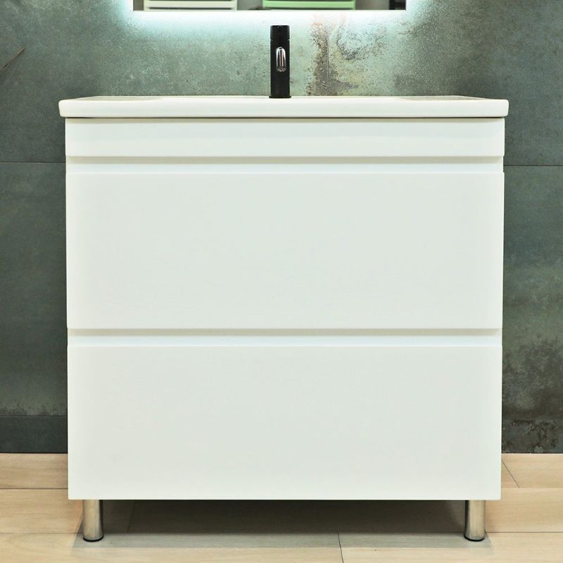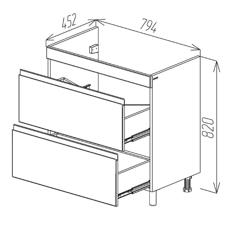 Напольная тумба под умывальник Argo 80 оснащена двумя выдвижными ящиками. Корпус выполнен из ДСП в белом цвете и имеет дополнительное матовое покрытие. Фасад состоит из белых лицевых панелей, которые выполнены из МДФ и окрашены влагостойкой матовой краской. Ручки в данной тумбе фрезерованные.
