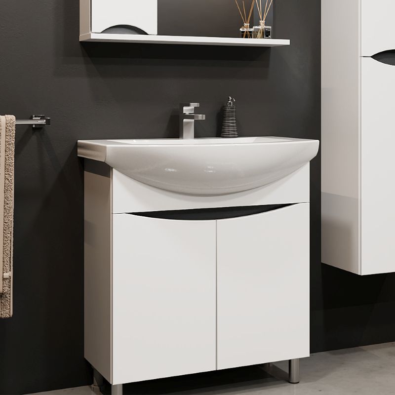Напольная тумба под умывальник Zenon 75 оснащена двумя распашными дверьми. Корпус выполнен из ДСП в белом цвете, имеет дополнительное матовое покрытие. Фасад состоит из белых лицевых панелей, которые выполнены из МДФ и окрашены влагостойкой матовой краской. Ручки в данной тумбе фрезерованные.