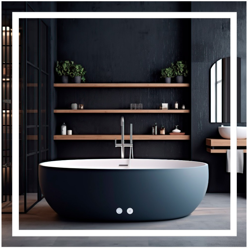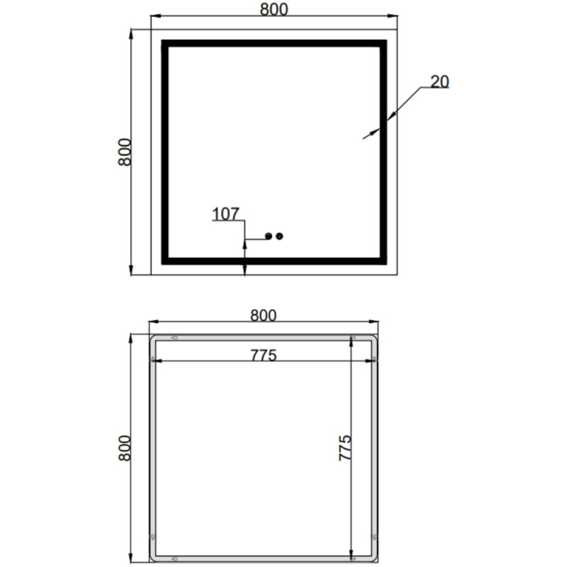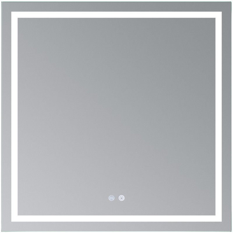 Зеркало Qtap Mideya с антизапотеванием 800x800 укомплектовано светодиодной лентой с ровным, насыщенным, ярким свечением белого цвета, которое не вредит зрению, и двумя сенсорными кнопками для подсветки и функции антизапотевания на передней части зеркала. В зеркало вмонтирован диммер.