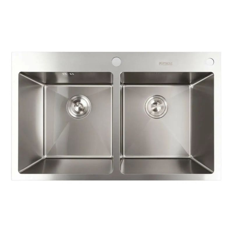 Отличный образец качества, вписывающийся в стандартные кухонный модуль 800х600 мм. Чаши мойки имеют одинаковый размер. На верхнем бортике расположены два отверстия: под кран - которое располагается с учетом подачи воды на обе чаши и отверстие под установку дозатора либо крана с питьевой водой. Оба отверстия при необходимости могут быть закрыты заглушками, идущими в комплекте.