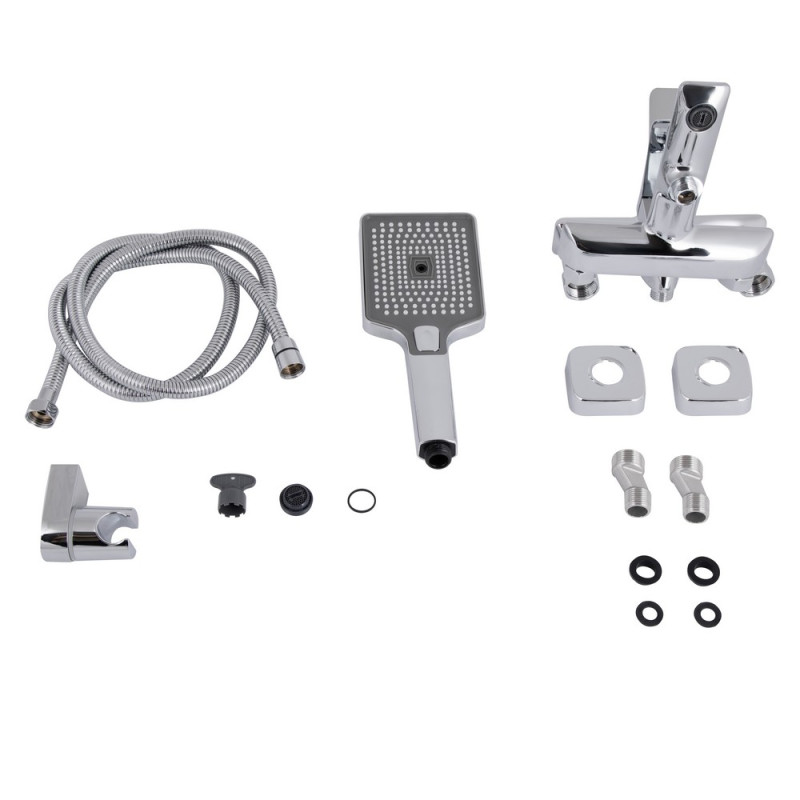 Комплектация - смеситель, эксцентрики, чашки декоративные (хромированные), резиновые прокладки, лейка, шланг, держатель лейки