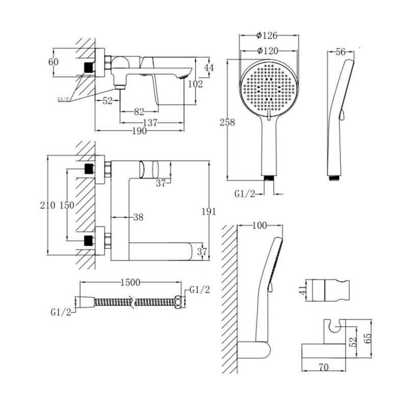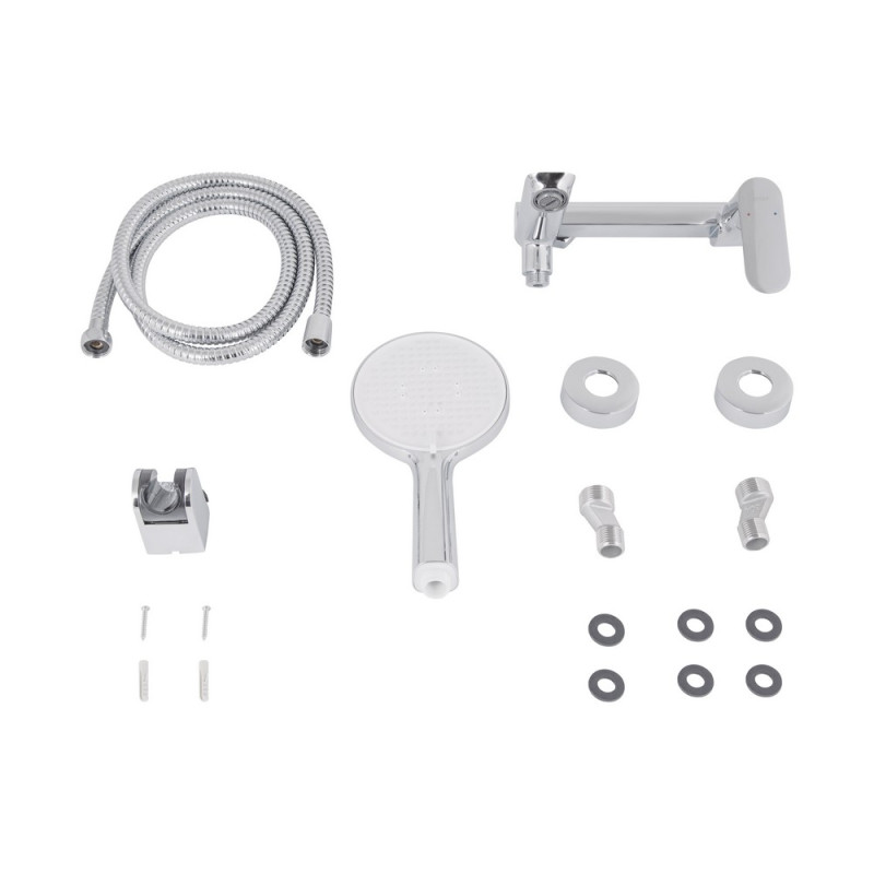 Комплектация - смеситель, эксцентрики, чашки декоративные (хромированные), резиновые прокладки, лейка, шланг, держатель лейки