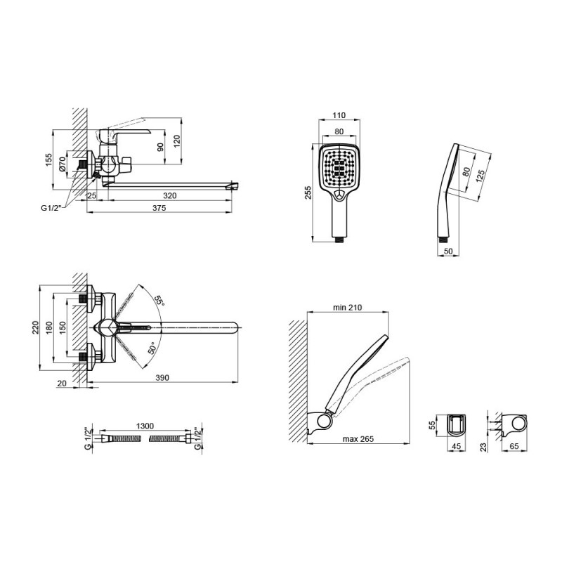 Модель поставляется с полным душевым гарнитуром, что позволяет сразу приступить к эксплуатации после монтажа: